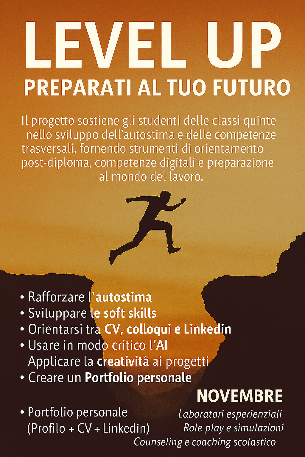 Si comunica che, a partire il 13 Novembre, avrà inizio il percorso “LEVEL UP – Preparati al tuo futuro”, un progetto di orientamento, crescita personale e crescita professionale dedicato agli studenti delle classi quinte, finalizzato allo sviluppo dell’autostima e delle competenze trasversali e fornire strumenti di orientamento post-diploma, competenze digitali e preparazione al mondo del lavoro.